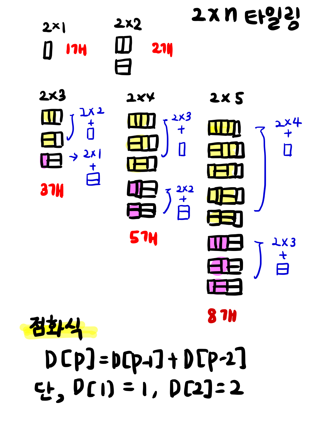 1. 2*1 타일링= 1개 , 2*2 타일링 = 2개 2. 2*3 타일링값은 2*2타일링에 세로막대기(2*1) 붙인 값 + 2*1 타일링값에 가로막대기 2개 붙인 값임 따라서, 2*3 타일링 값 = 2*2 타일링 값 + 2*1 타일링 값 즉, d(n) = d(n-1) + d(n-2) |